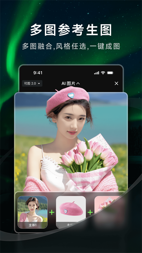 2、 AI 图片:支持文生图和图生图,基于描述和参考图,可以生成多种尺寸、多种风格的创意图片,更支持将图片一键生成视频。