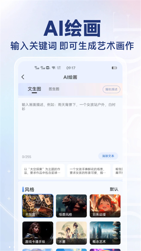 3、【AI绘画】输入自己想要的画面描述,它就能一键式生成色彩绝伦,画面精美的AI绘画图片,无论您的想法多天马行空,只要描述得当都能满足你的需求。