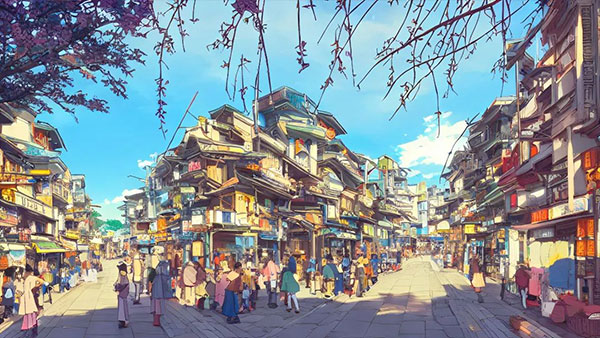 2、输入:街道,热闹的人群,色彩鲜明,石砖路,宫崎骏风