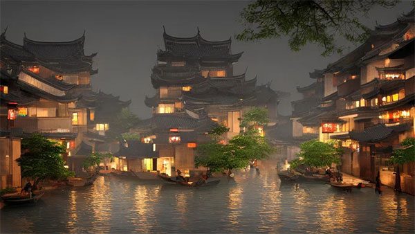 1、输入:江南水乡,渔船,烛灯,水面上有灯的倒影,烟雾缭绕,高清细节
