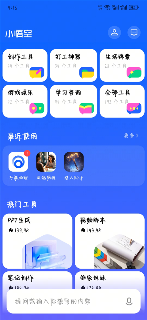 小悟空ai智能工具即小悟空App,是字节跳动旗下多功能AI助手与工具库,集成了超过200个智能工具,覆盖创作生成、学习提升、工作职场、专业咨询、虚拟角色和休闲娱乐等六大模块,主要帮助用户在创作生成、学习提升等工作、学习方面提高效率。