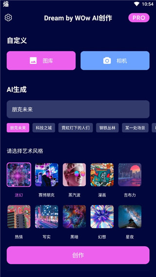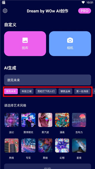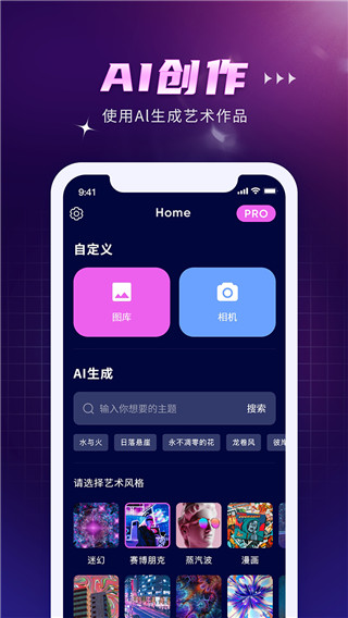 1、下载好app后,点击进入,在主页面中就可以直接开始使用。其中最重要的就是关键字,用户可以直接使用软件为你准备的关键字,也可以自己输入,在选择下方的艺术风格,越详细生成出来后就越贴近主题。
