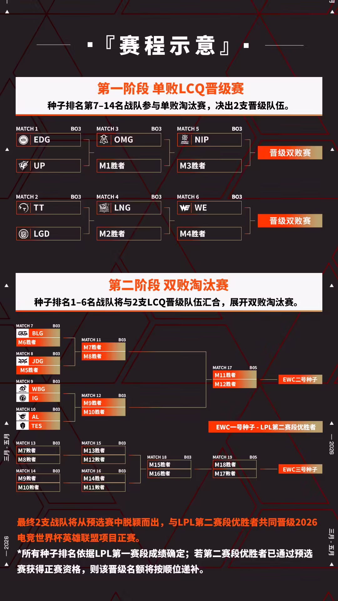 根据官方公布的赛制,本次预选赛分为两个阶段进行。第一阶段在 3 月 27 日至 3 月 29 日进行,由 LPL 第一赛段 7-14 名的战队通过分组单败冒泡赛争夺 2 个晋级名额。成功晋级的两支队伍,将在 3 月 30 日至 5 月 22 日与 LPL 第一赛段前 6 名战队共同展开双败淘汰制对决。