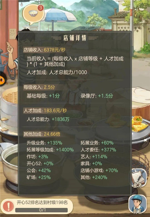 3、其他加成 = 升级业务+拓展业务+拓展等级加成+人才委任+作坊+艺人+开心52+家具+公会+店铺小游戏+矿场+其他(鱼摊、旧物),通过对应玩法获得收入提升