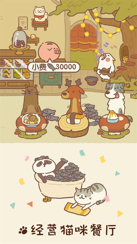 1、用获得的小鱼干和星星来购买餐厅设施,餐厅设施越多来的客人就会越多。