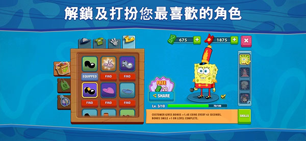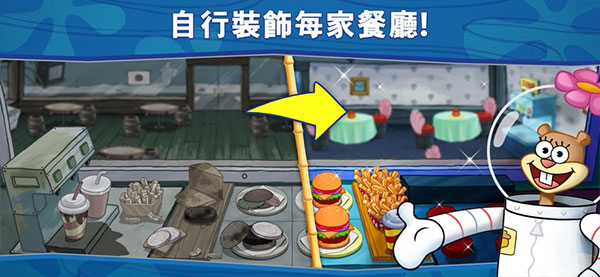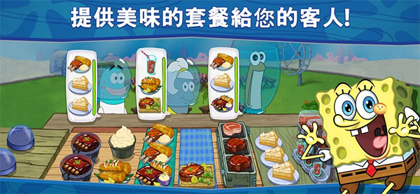 在海绵宝宝餐厅模拟器游戏中可以体验海绵宝宝,蟹老板,章鱼哥,珊迪和派大星带来的全新独家海绵宝宝故事。在游戏中逐步前进并解锁新关卡时,您会在有趣的故事情节中进行游戏。