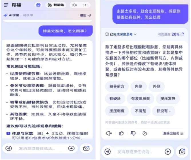 该应用的核心功能覆盖了日常健康需求的方方面面,AI 健康问答是使用率最高的功能,在首页点击 AI 问诊,支持文字、语音、图片多种输入方式,平台会以递进式提问完成问诊,同步展示问诊进度,最终给出合理化健康建议。