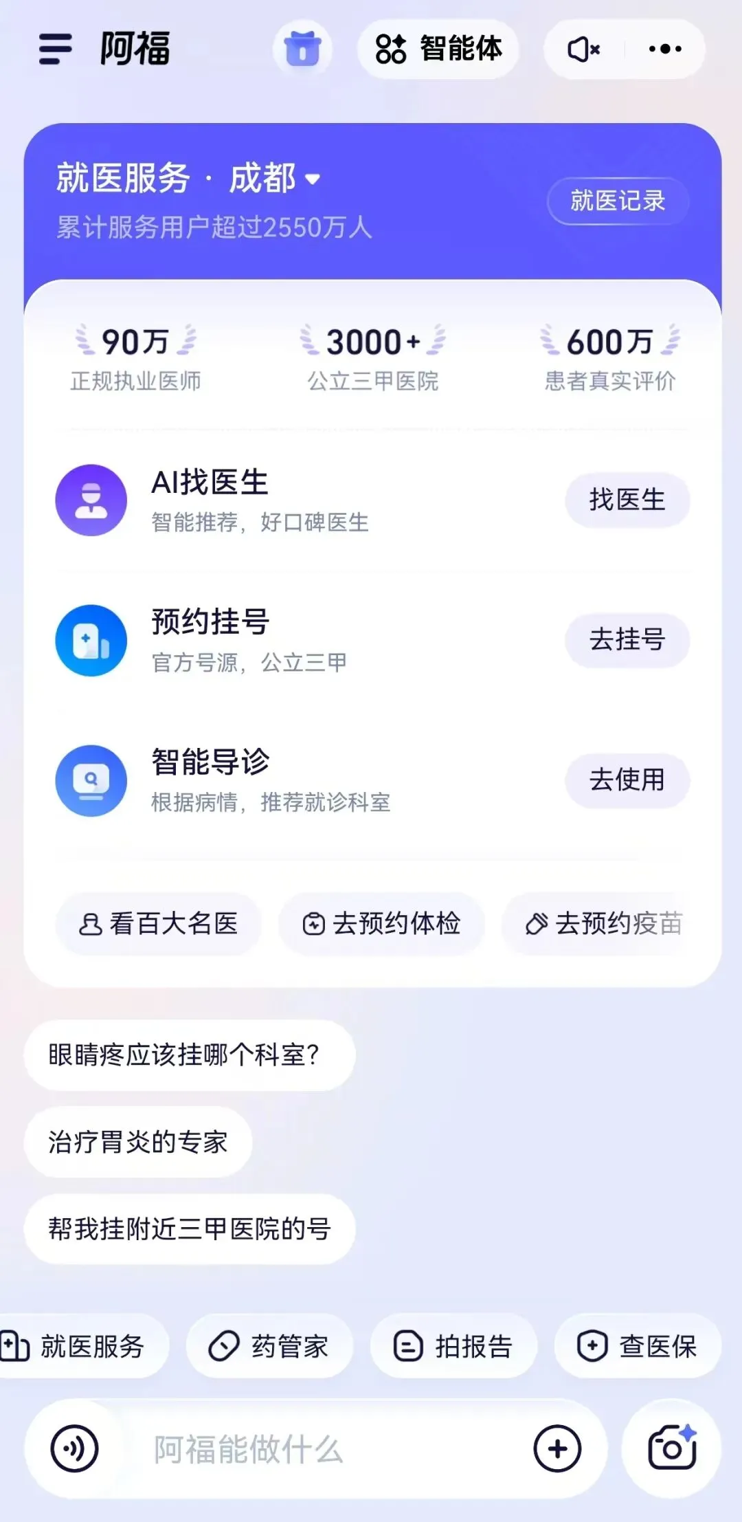首页点击“AI诊室”,输入你想咨询的健康问题,支持文字、图片、语音多种输入方式。