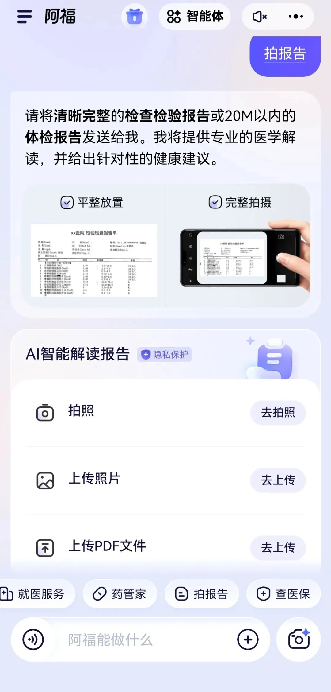 针对体检报告晦涩难懂的问题,报告解读功能可通过拍照上传报告,自动解析各项指标,标注异常数据并生成对比分析,为线下就医提供参考。