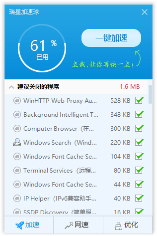 启动瑞星杀毒软件后,桌面会出现浮动的加速球,菜单中自动勾选了建议优化的程序,请根据需要勾选。点击【一键加速】,完成优化。