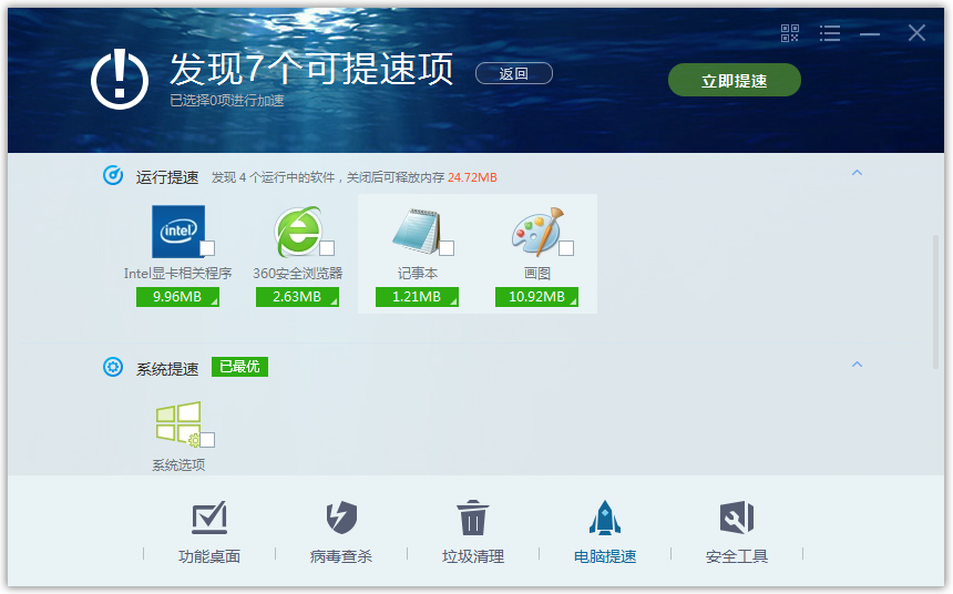 电脑优化功能主要分为四大模块:开机加速、网络加速、系统加速及垃圾清理。