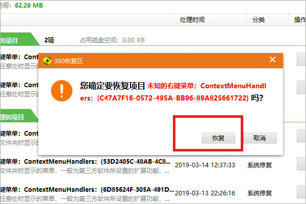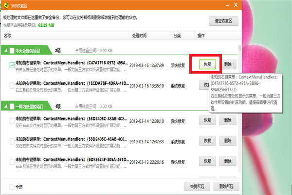5、点击该文件尾端红色区域位置的“恢复”选项,对文件进行恢复;