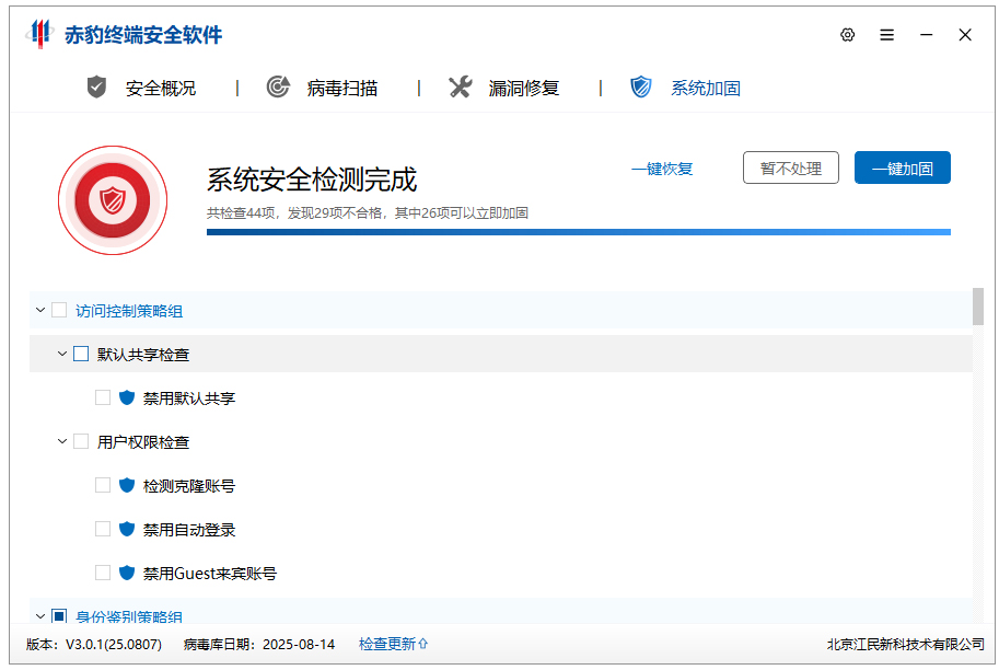 6、支持系统加固,包括禁用默认共享,禁用自动登录,关闭非必要端口,开启自动更新等。