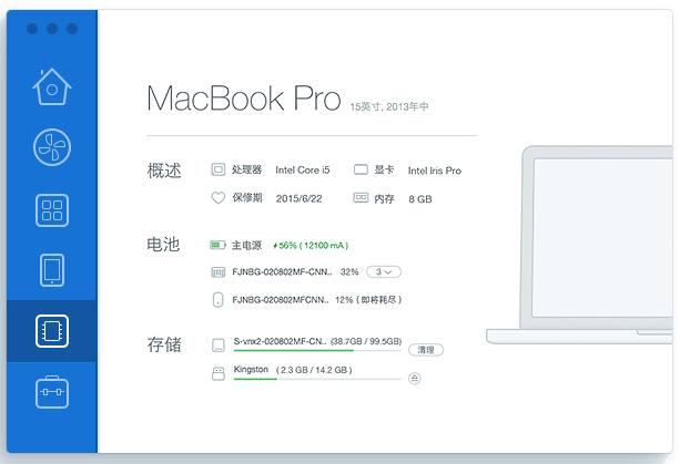 我们集成了电脑整体信息展示(包括CPU、内存、显卡和)保修信息内容),磁盘使用情况让你一目了然掌握电脑空间使用量,还有电量显示包括电池和蓝牙设备的电量。