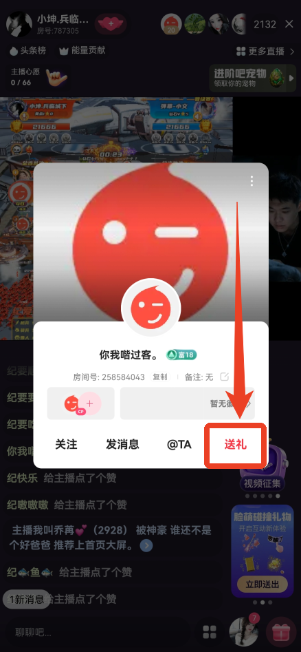 3、不仅可以给主播送礼物,我们也能给其他用户送礼物。点击公屏的名字。
