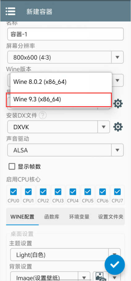 新建一个容器,wine系统下拉选择‘Wine 9.3(x86_64)