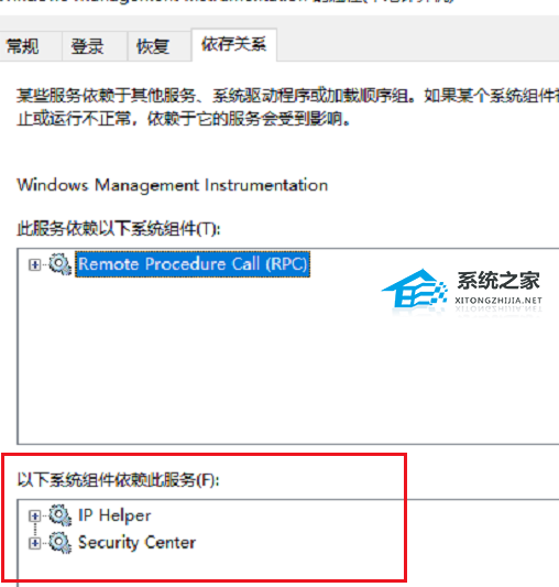 3、进去“Windows Management Instrumentation”服务之后,点击依存关系,可以看到“IP Helper”和“Security Center”组件依赖此服务。