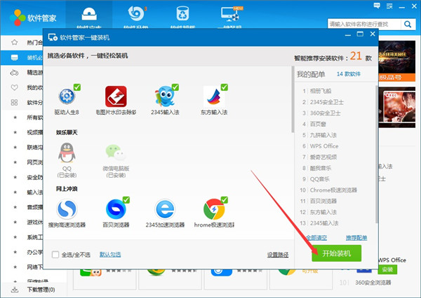 3、选择软件“默认勾选”中推荐的软件,然后点击右下角“开始装机”就可以了;