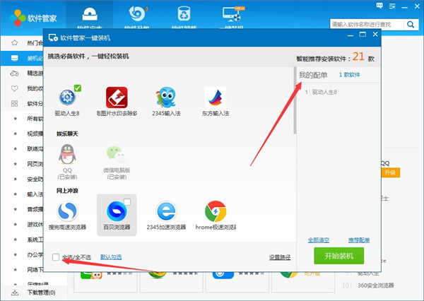 4、如果你对默认勾选的软件不满意,可以选择“全部清空”,然后再重新选择你需要下载的软件,点击“开始装机”即可;